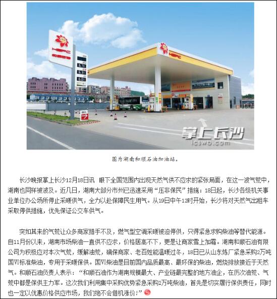 近幾日,湖南部分市州已迅速采取“壓非保民”措施,停止了眾多商家及出租車(chē)的燃氣供應。突如其來(lái)的氣荒讓大家措手不及。為了確保市場(chǎng)供油穩定,讓星城人民溫暖過(guò)冬,順暢出行,和順石油積極應對,從山東緊急采購2萬(wàn)噸國VI標準柴油,專(zhuān)門(mén)用于市場(chǎng)保供,切實(shí)履行企業(yè)社會(huì )責任,同時(shí)以?xún)?yōu)惠價(jià)格供應市場(chǎng),絕不借機漲價(jià)。